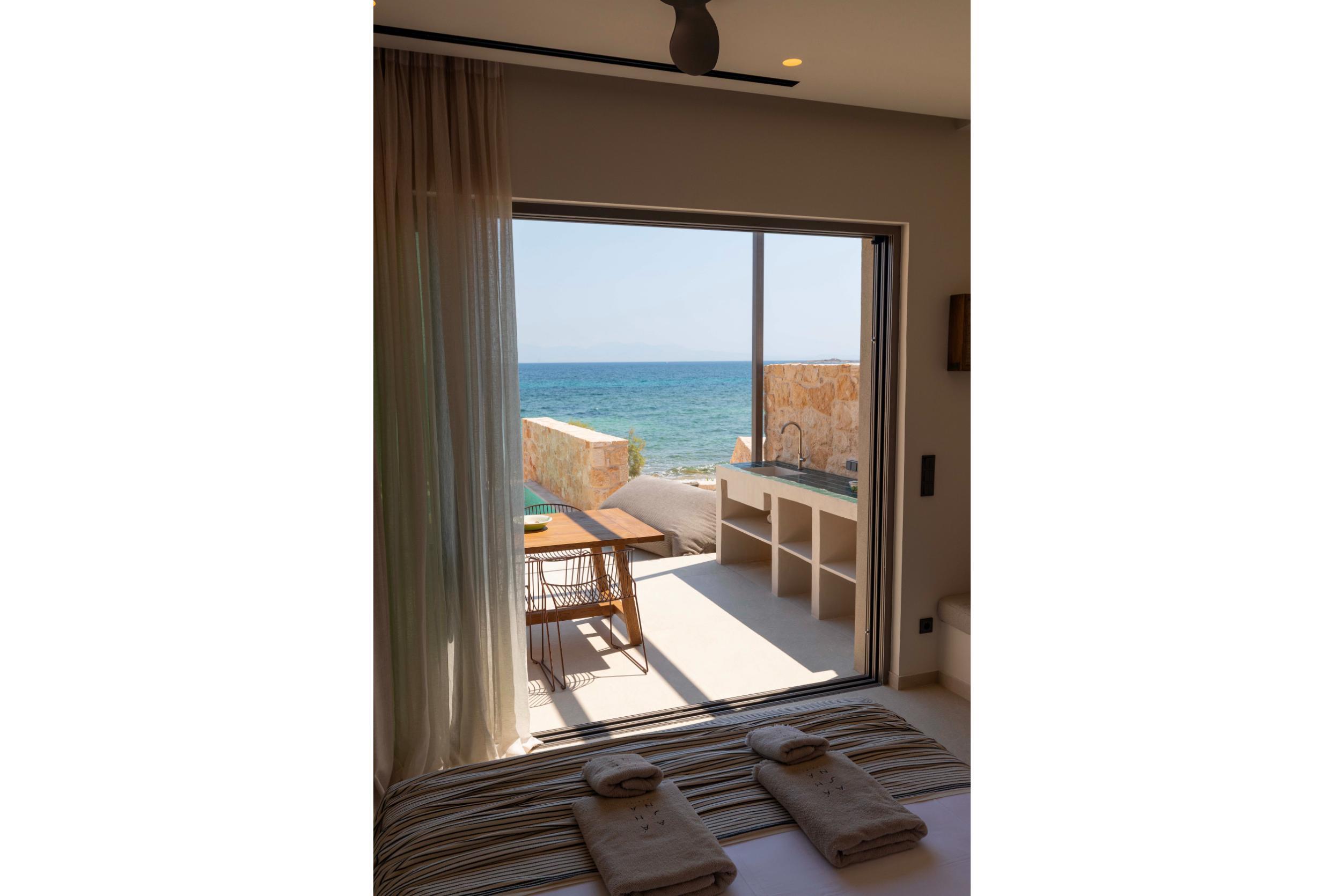 The bedroom is on the same level as the private pool, offering direct access to the water and to the sea, which lies just a few steps away from your bed.Afanti Suite is a bright, elegantly designed open-plan space, where minimal aesthetics meet natural tranquility.