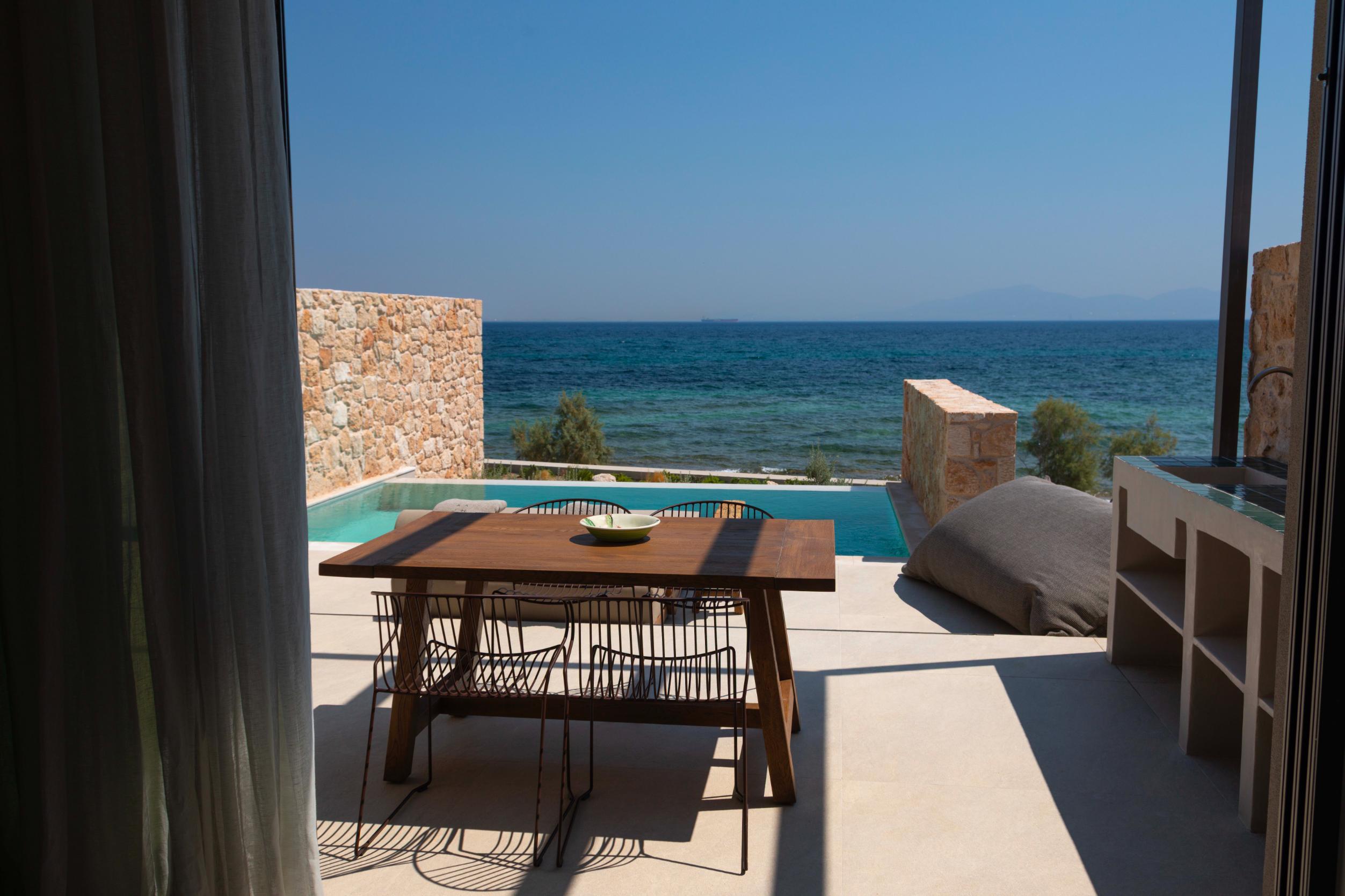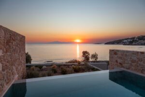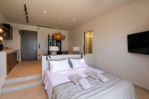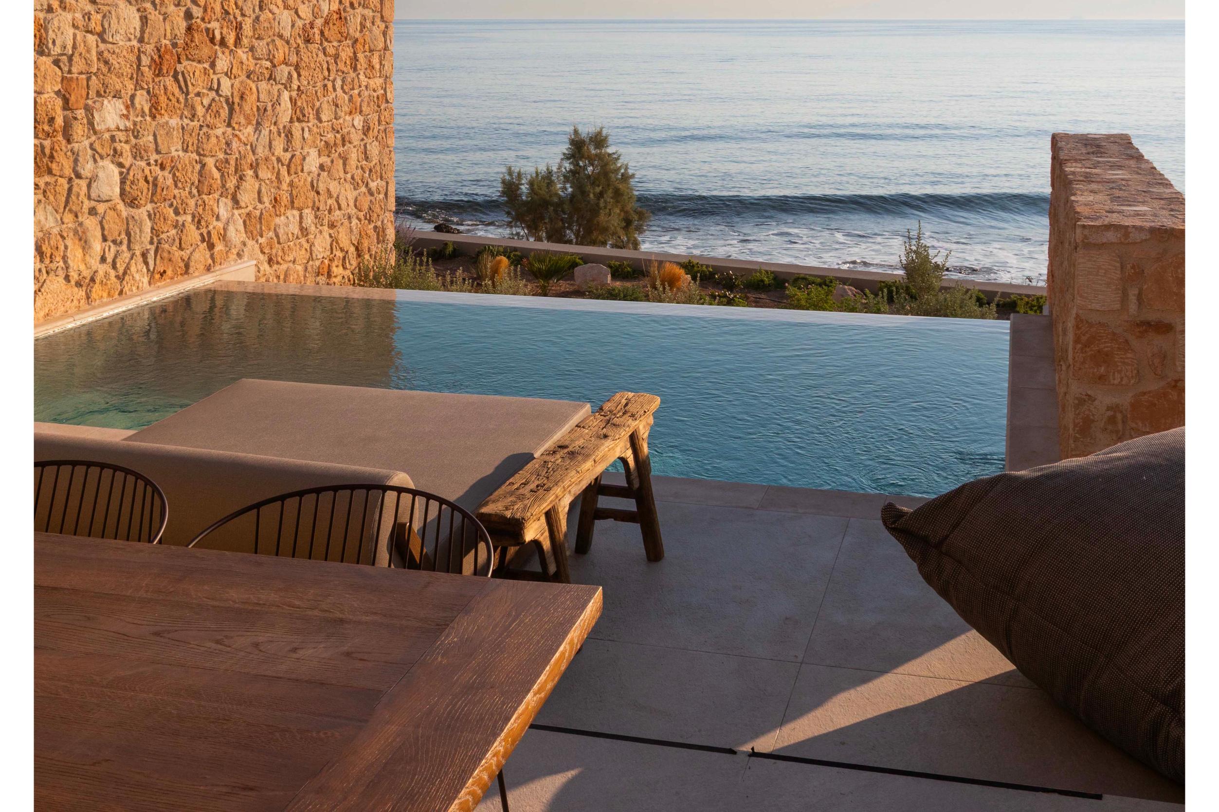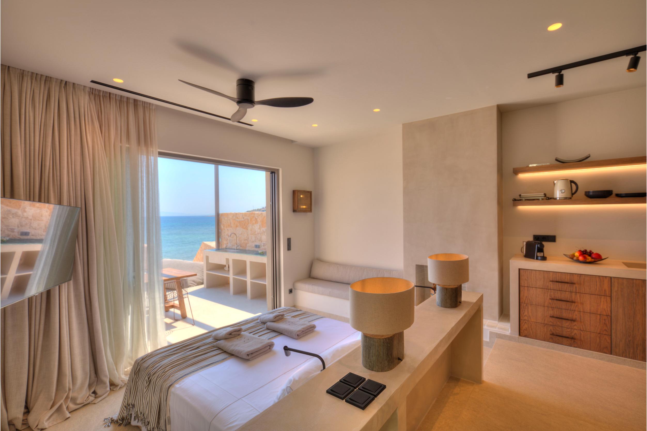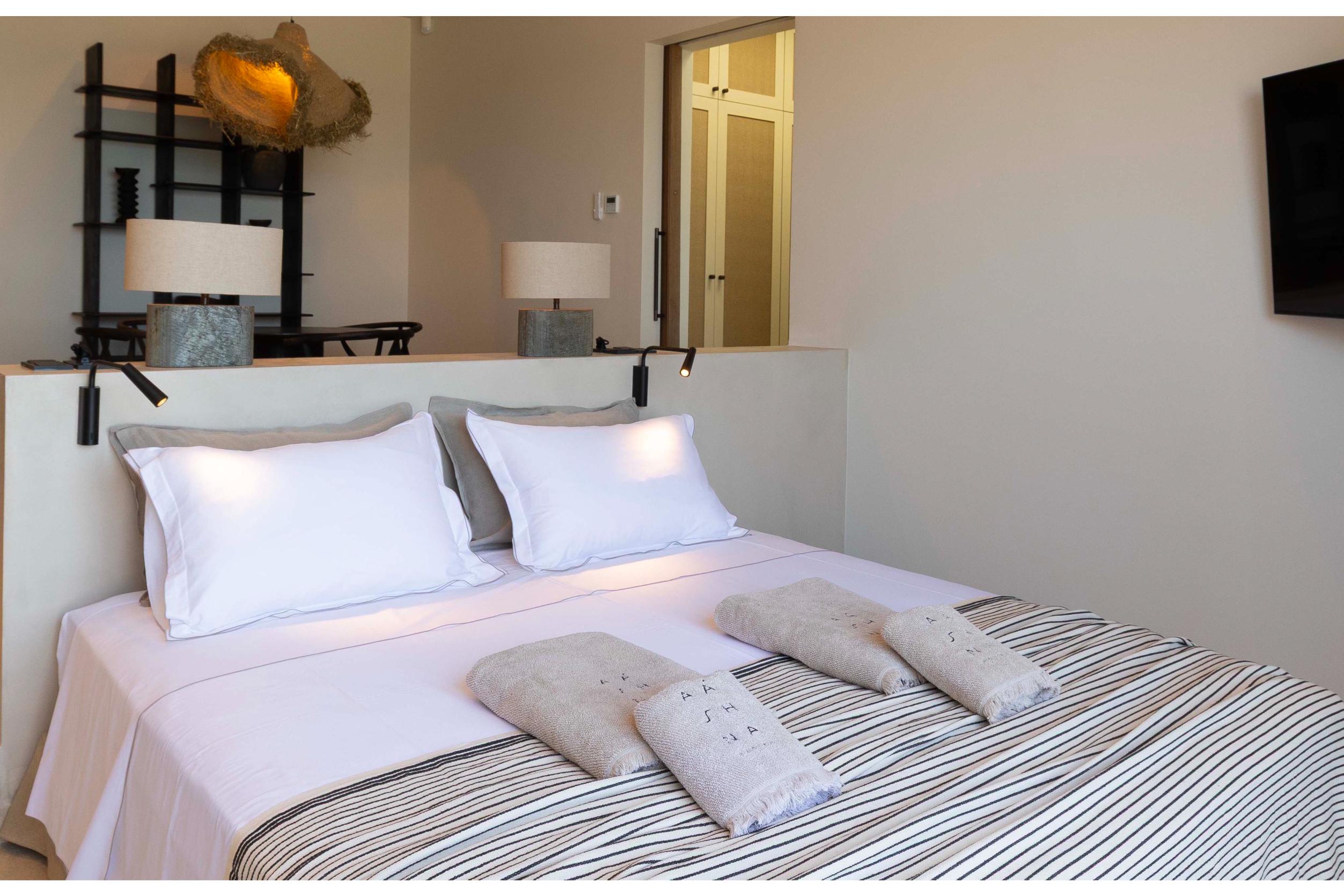 Καθώς ξυπνάς, το βλέμμα σου χάνεται στο γαλάζιο, ντυμενο με τα χρωματα της ανατολής. Το υπνοδωμάτιο βρίσκεται στο ίδιο επίπεδο με την πισίνα, προσφέροντας άμεση πρόσβαση στο νερό και στη θάλασσα, που απλώνεται μόλις λίγα βήματα μπροστά σου.