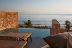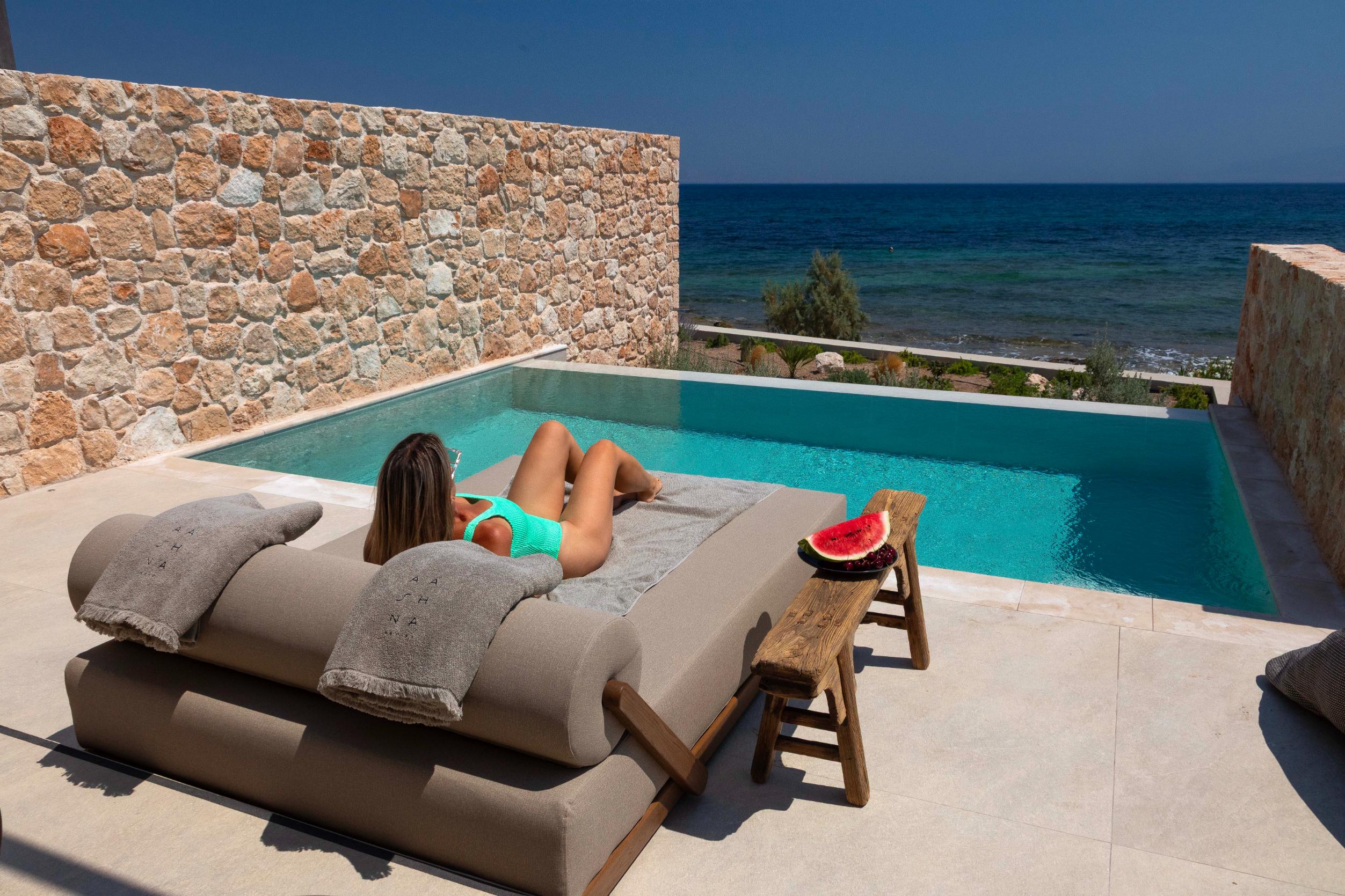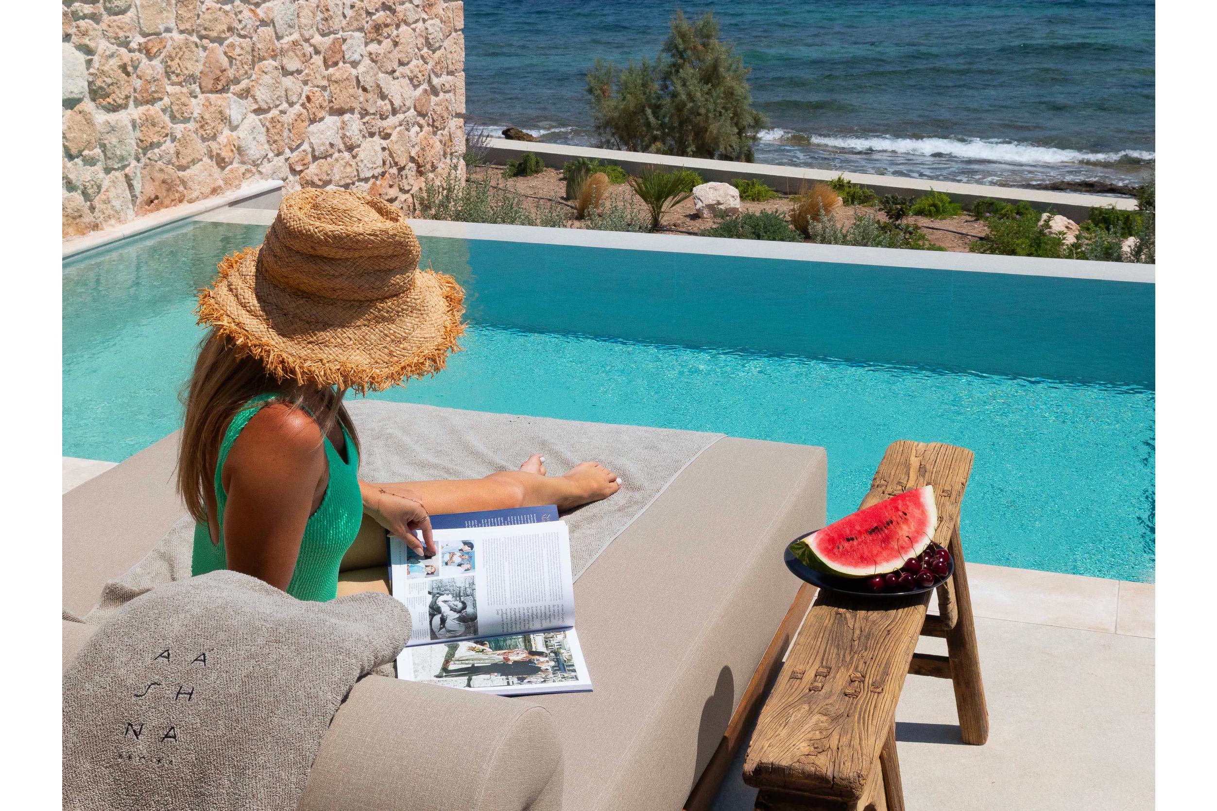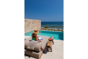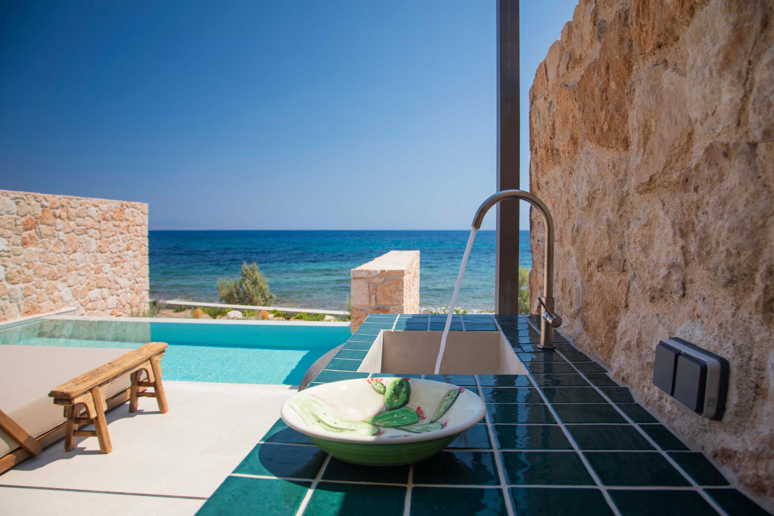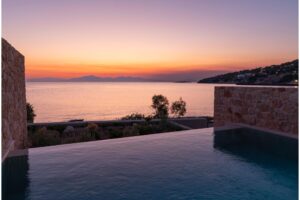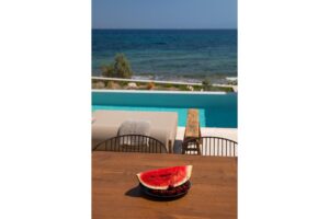 Καθώς ξυπνάς, το βλέμμα σου χάνεται στο γαλάζιο, ντυμενο με τα χρωματα της ανατολής. Το υπνοδωμάτιο βρίσκεται στο ίδιο επίπεδο με την πισίνα, προσφέροντας άμεση πρόσβαση στο νερό και στη θάλασσα, που απλώνεται μόλις λίγα βήματα μπροστά σου.