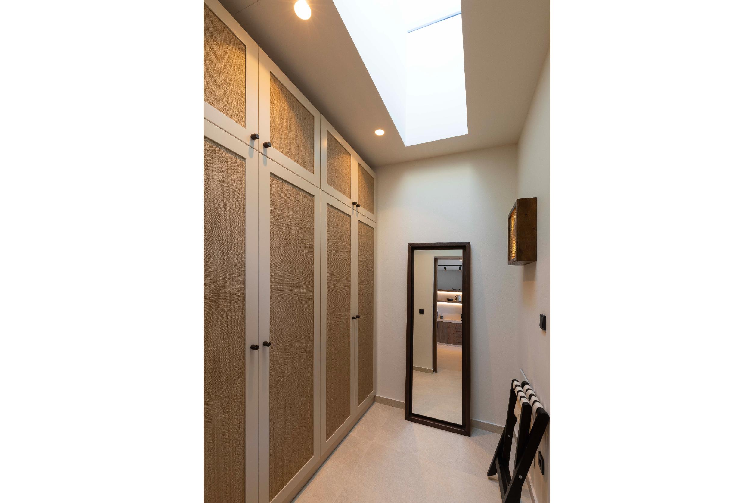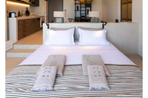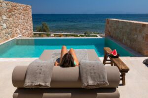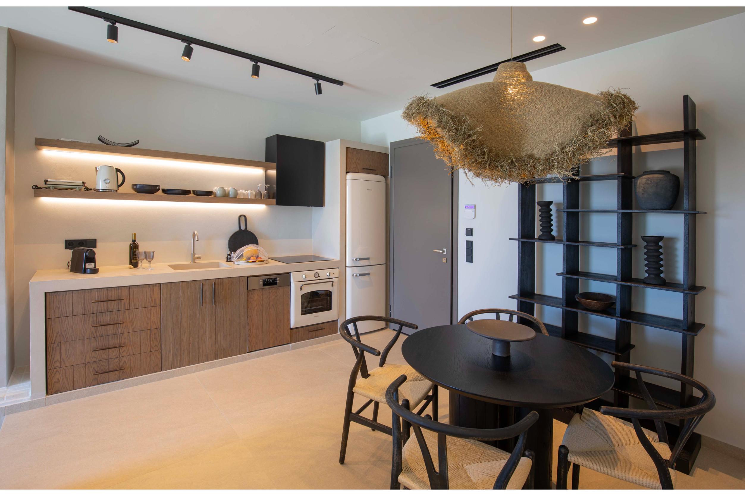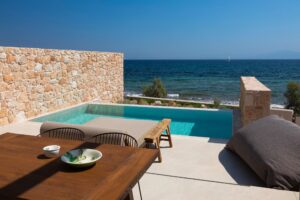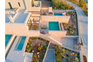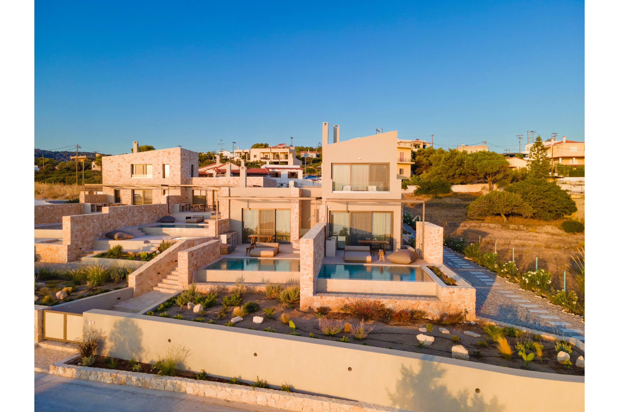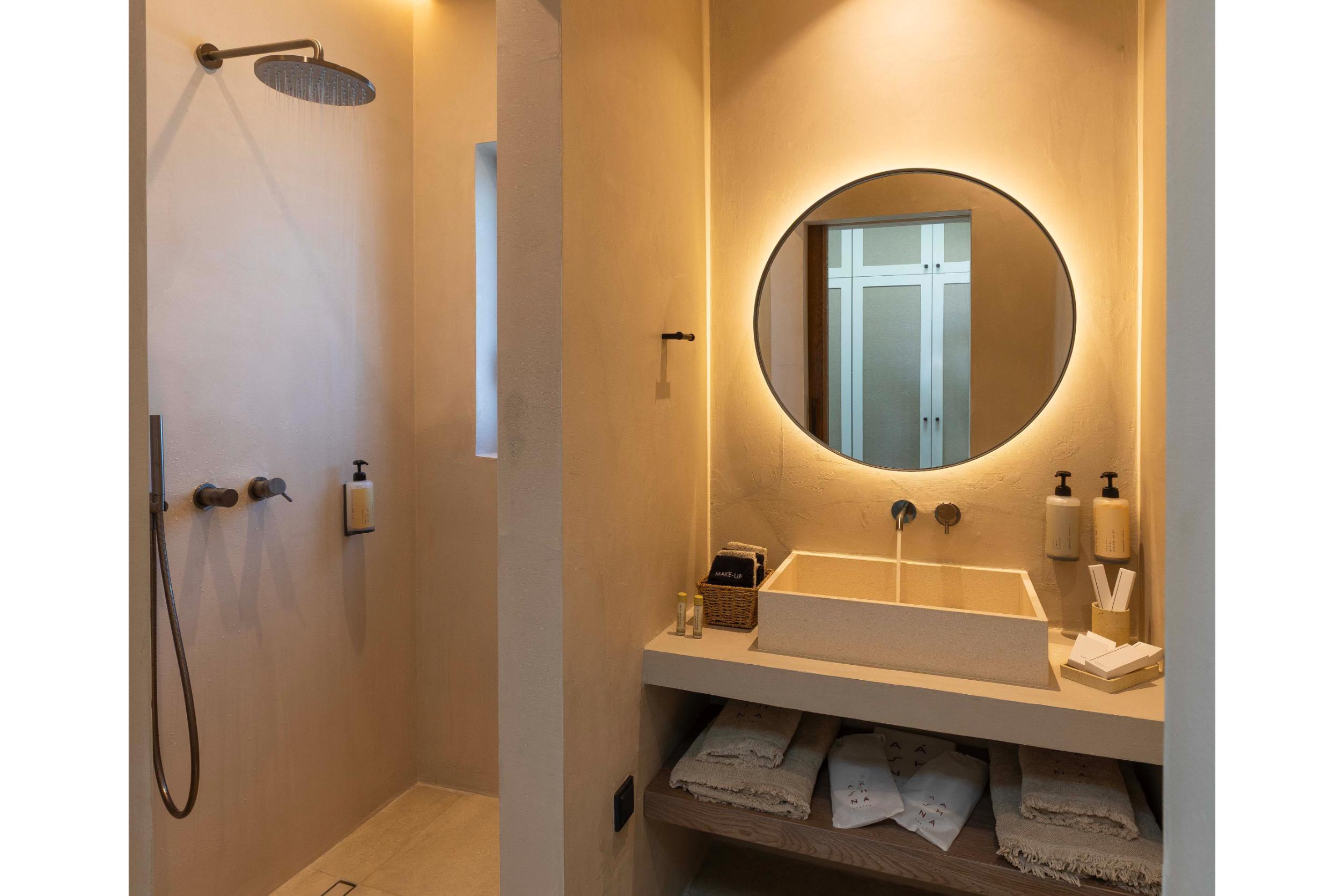 Καθώς ξυπνάς, το βλέμμα σου χάνεται στο γαλάζιο, ντυμενο με τα χρωματα της ανατολής. Το υπνοδωμάτιο βρίσκεται στο ίδιο επίπεδο με την πισίνα, προσφέροντας άμεση πρόσβαση στο νερό και στη θάλασσα, που απλώνεται μόλις λίγα βήματα μπροστά σου.
