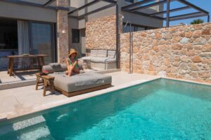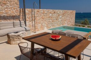 Το στρώμα είναι της εταιρείας Simmons, τα κλινοσκεπάσματα υψηλής ποιότητας, και ο χώρος διαθέτει ανεμιστήρες οροφής για φυσική δροσιά. Κάθε λεπτομέρεια έχει επιλεγεί με φροντίδα και διακριτική πολυτέλεια από τα υφάσματα μέχρι τη συνολική αίσθηση του χώρου.Η σουίτα διαθέτει πλήρως εξοπλισμένη κουζίνα, ιδιωτική πισίνα και εξωτερικό καθιστικό με BBQ, για αυθεντικές στιγμές χαλάρωσης δίπλα στη φύση.