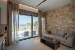 Οι μεγάλες τζαμαρίες του σαλονιού ανοίγουν σε έναν ενιαίο εξωτερικό χώρο, με μοντέρνα καθίσματα, ιδιωτική πισίνα και ανεμπόδιστη θέα στη θάλασσα — κυριολεκτικά δίπλα σας.